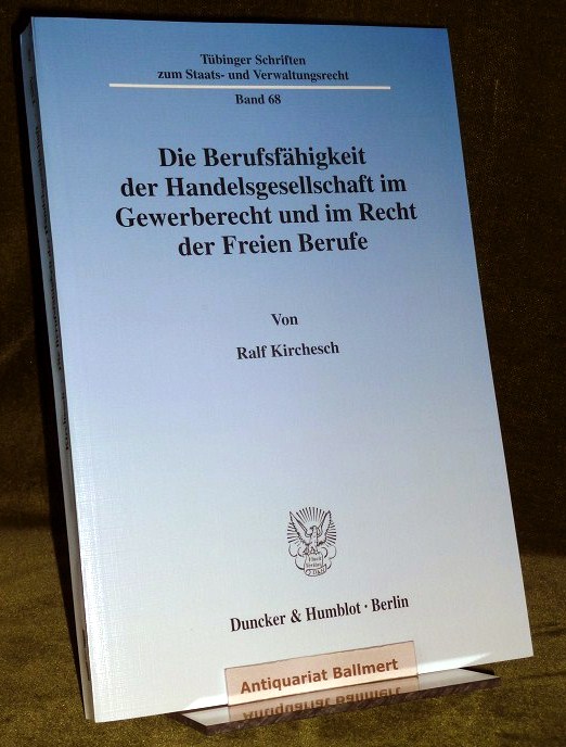 Kirchesch, Ralf: Die Berufsfähigkeit der Handelsgesellschaft im Gewerberecht und im Recht der freien Berufe. Zugleich ein Beitrag zum Problem der Einheit der Rechtsordnung. Berlin, Duncker und Humblot, 2002. 24 cm. 379 Seiten. kart., Softcover, sehr gutes Exemplar, wie neu. [Tübinger Schriften zum Staats- und Verwaltungsrecht ; Bd. 68].