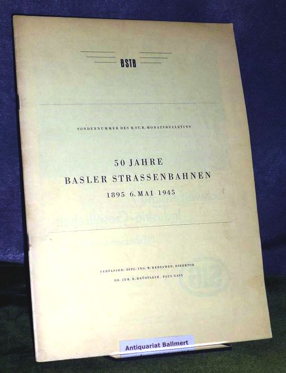 Rebsamen, W. / Direktion der Basler Strassenbahnen [Hrsg.]: 50 Jahre Basler Strassenbahnen. 1895 – 6. Mai 1945. Sondernummer des BSTB Monatsbulletins. Basel, Basler Druck- und Verlagsanstalt, 1945. 30x21 cm. 40 Seiten, illustriert. Geheftet, 2x Namensvermerk, gutes Exemplar.