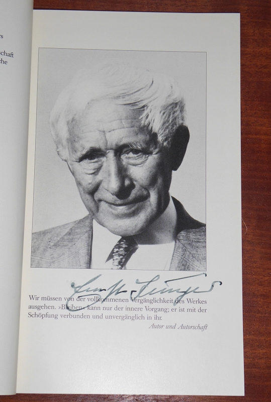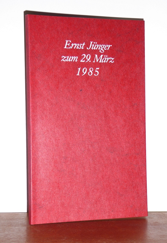 Jünger, Ernst: Ernst Jünger zum 29. März 1985. [Erschienen zum 90 Geburtstag, SIGNIERT von Ernst Jünger]. Privatdruck für die Freunde Ernst Jüngers. Stuttgart, Verlagsgemeinschaft Ernst Klett Verlag – J. G. Cotta’sche Buchhandlung, 1985. 21,5 cm. 69 Seiten, Texte und Bilder. Englische Broschur, sehr gutes Exemplar.