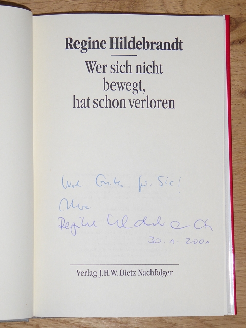 Hildebrandt, Regine: Wer sich nicht bewegt, hat schon verloren. [Mit Widmung, signiert u. datiert] 2. Auflage. Bonn, Dietz, 1997. 21 cm. 159 Seiten. Pappband mit Schutzumschlag. Exemplar in sehr guter Erhaltung.