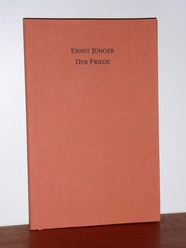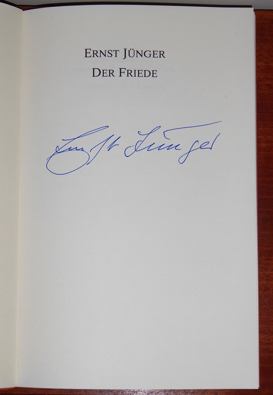 Jünger, Ernst: Der Friede. Der Jugend Europas zum 29. März 1985, dem 90. Geburtstag Ernst Jüngers. Stiftung F.V.S., zu Hamburg. (Titelblatt SIGNIERT von Ernst Jünger). Privatdruck, Stuttgart, Rampf, 1985. 23 cm. 50 S., Englische Broschur, sehr gutes Exemplar.