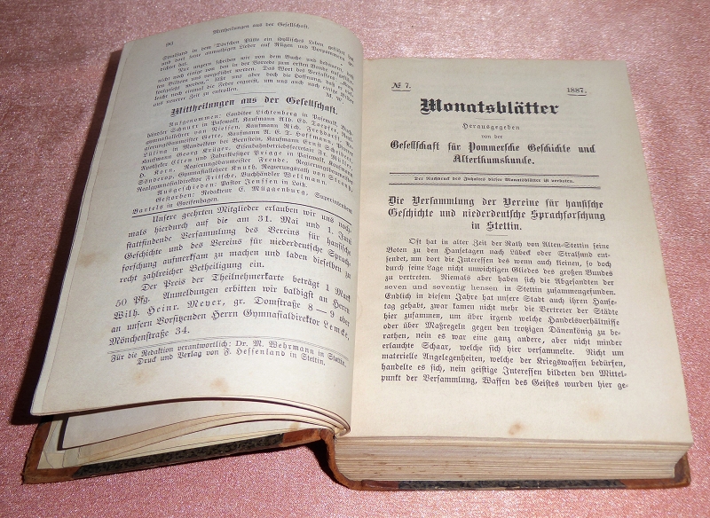 Gesellschaft für Pommersche Geschichte und Alterthumskunde (Hrsg.): Monatsblätter der Gesellschaft für Pommersche Geschichte und Alterthumskunde aus 1887 bis 1893. Stettin, Stettin, Herrcke & Lebeling, 1887 – 1893. 20x13 cm. Insgesamt ca. 1000 Seiten. teilweise illustriert. Halbleder der Zeit. Etwas berieben, Bibliotheksaufkleber. Vorsatzblatt teilweise mit Buchdeckel verklebt. Die ersten Blatt etws knittrig, sonst meist nur geringe Gebrauchsspuren, wenige Anstreichungen od. Anmerkungen in Blei. Insgesamt gute Erhaltung. Folgende Monatsblätter sind enthalten: 1887 Nr. 4, 6, 7, 8, 10 / 1888 Nr. 3, 4, 5, 6, 8, 10, 11, 12 / 1889 Nr. 1, 2, 4, 5, 6, 9, 10, 11, 12 / 1890 Nr. 2, 3, 4, 5, 6, 7, 8, 10, 11, 12 / 1891 Nr. 1, 2, 3, 6, 9, 10, 11, 12 / 1892 Nr. 1, 2, 3, 4, 5, 6, 7, 8, 9, 10, 11. / 1893 Nr. 1-12 komplett.