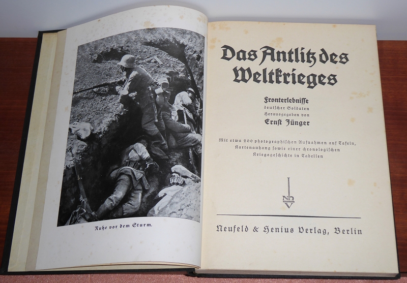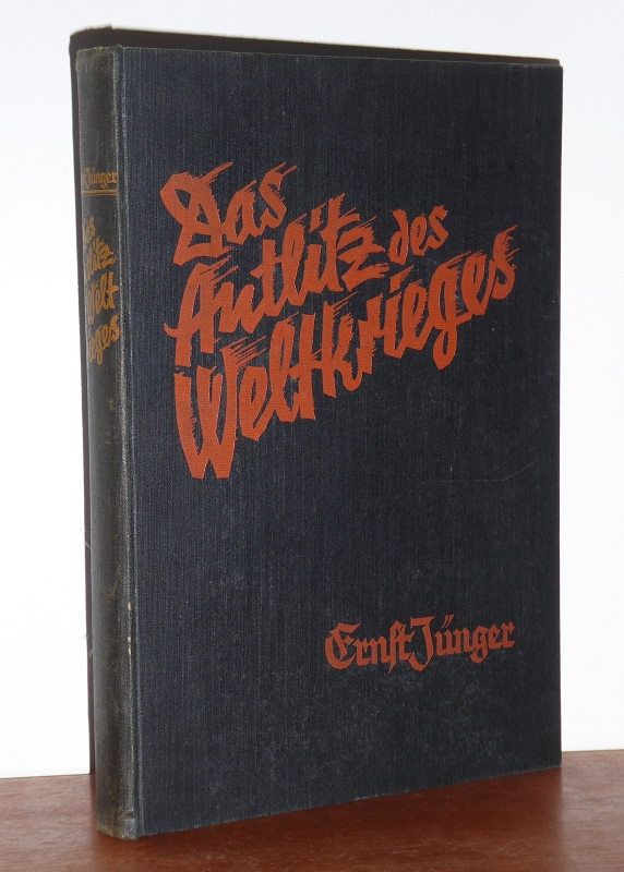 Jünger, Ernst (Hrsg. u. Autor einiger Abschnitte): Das Antlitz des Weltkrieges.[Hauptband]: Fronterlebnisse deutscher Soldaten. (Vortitelblatt mit WIDMUNG, von Jünger SIGNIERT und datiert). Mit etwa 200 photographischen Aufnahmen auf Tafeln, Kartenanhang sowie einer chonologischen Kriegsgeschichte in Tabellen / hrsg. von Ernst Jünger. Berlin, Neufeld & Henius, 1930. 25x18 cm. 327, VIII Seiten. Illustriert. Leinen, ohne Schutzumschlag. Einband etwas Einband berieben, Gelenk geplatzt. Schnitt und einige Seiten braunfleckig, sonst gutes Exemplar. Signiert sehr selten!
