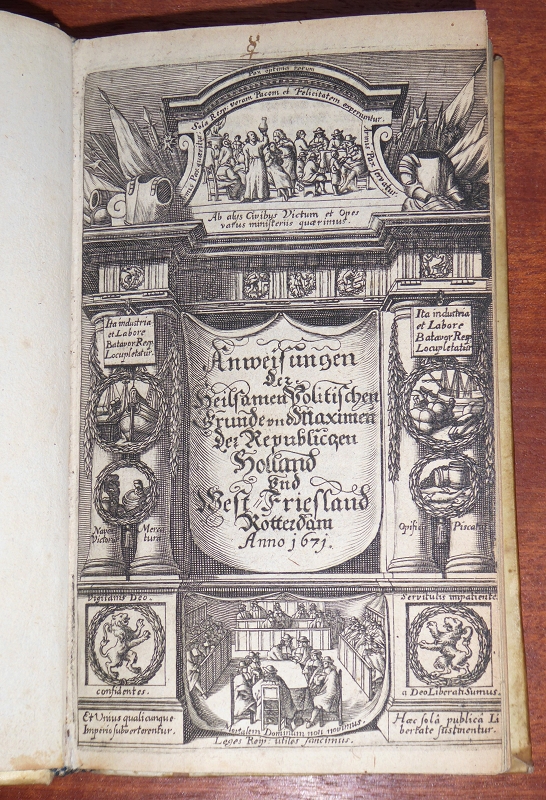Court, Pieter de la: Anweisungen der heilsamen, politischen Grunde und Maximen der Republicqen Holland und West-Friesland. Rotterdam [= Frankfurt/Main], Wächtler, 1671. 8° (18x11 cm). [19] Blatt, 423 Seiten. Kupfertitel. Pergament der Zeit. Handgeschriebener Rücktitel, umlaufender Farbschnitt. Einband etwas berieben u. fleckig. Blattrand etws beschnitten. Ein Blatt mit 2 kl. Flecken, insgesamt gutes Exemplar.