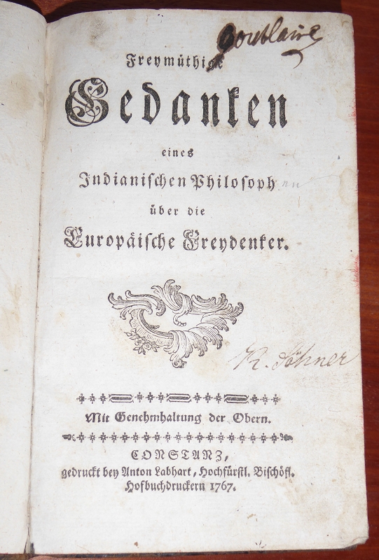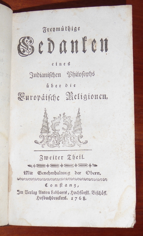 [Erster Theil]: Freymüthige Gedanken eines Indianischen Philosoph über die Europäische Freydenker; Zweiter Theil: Freymüthige Gedanken eines Indianischen Philosophs über die Europäische Religionen. 2 Teile in einem Band. Konstanz, Labhart, 1767-1978. 8°. 82 S. [2] Bl.; 138 S., [1] Bl. Teils als Gespräch verfaßte satirische Schrift. Leder. Rotschnitt. Einband etwas beschabt, einige Wurmlöcher, Buchrücken beschädigt. Schnitt angestaubt. Vorsätze mit nebulösen Notizen. Titelblatt mit Namen alter Hand. Seiten teils eselsohrig, angerändert, fleckig und/oder wsserrandig. Trotz zahreicher kleiner Mängel insgesamt noch ordentliches Exemplar der Originalausgabe..