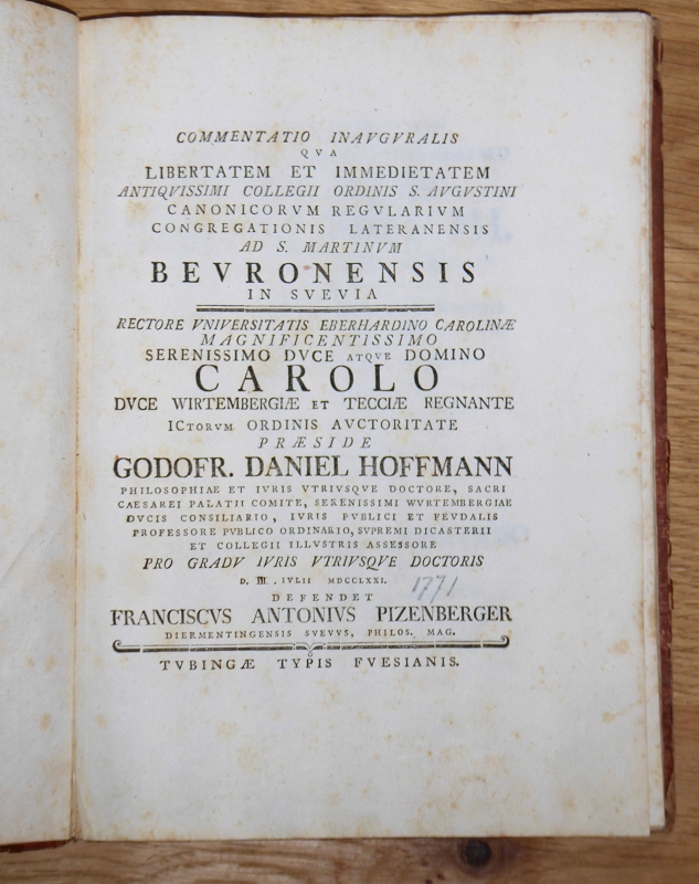 Hoffmann, Godofr. Danliel (Praeside): Commentatio Inavgvralis qva Libertatem et Immedietatem Antiqvissimi ordinis S. Augustini canonicorum regularium congregationis Lateranensis ad S. Martinum Beuronensis in Suevia … Tübingen, Fuesianis 1771. 4° (25 cm). 116, 88 Seiten. Mit einigen Holzschnitt – Siegeln. Sprache meist Latein, teilweise aber auch Deutsch. Pappband, Einband beriebn u. bestossen, Buchrücken beschädigt. Durchgehend, meist nur gering, stockfleckig.
