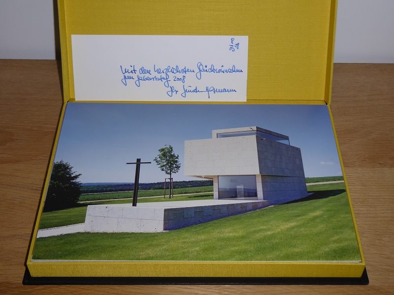 Tuttlingen: Günter Herrmann (Architekt): Bildmappe zum 65. Geburtstag vom Prof. Ungethüm mit 17 fotografischen Abbildung der Kapelle „St. Johannes und Jakobus“. Bilder 30x21 cm in Kartonstärke. 17 Blatt. Mit handschriftlichem Geburtstagsgruß des Architekten. Bildmappe aus Leder und Leinen. Diese etwas berieben. Bilder in sehr guter Erhaltung. Prof. Michael Ungethüm (Aesculap AG) war Stifter der Kapelle St. Johannes und Jakobus auf dem Witthoh südlich von Tuttlingen.