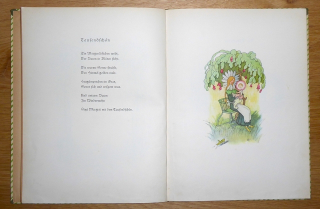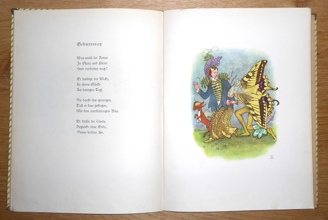 Kreidolf, Ernst: Bei den Gnomen und Elfen. Zürich [u.a.], Rotapfel-Verlag, 1929. quarto. [12] Blatt, Illustrationen und Verse. Halbleinen, Einband etwas gebräunt, berieben und etwas fleckig. Ecken und Kanten berieben und bestoßen. Innen, Vorsatz unten im Gelenk angeplatzt. Papierbedingt etwas gebräunt, kaum fleckig, vereinzelt gering fingerknittrig. Trotz der beschriebenen Mängel insgesamt noch schönes Exemplar.