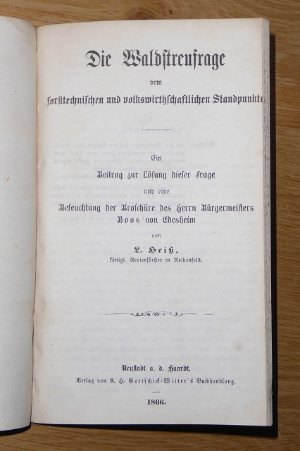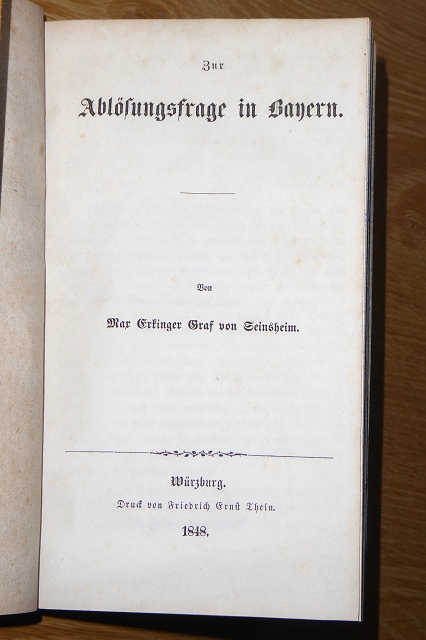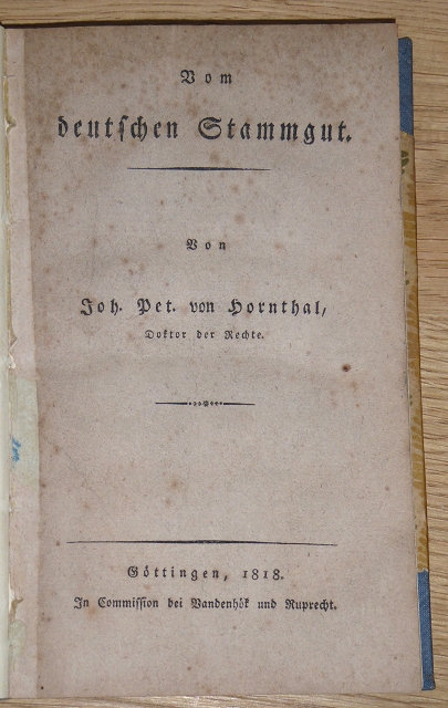 Hornthal, Joh. Pet. von (Doktor der Rechte): Vom deutschen Stammgut. [Beigebunden ist:] Graf von Seinsheim: zur Ablösefrage in Bayern (Würzburg, Thein, 1848, 16 S.); Von einem Freunde seiner Vaterstadt Ulm: Actenmäßige Darstellung (Ulm, Nübling, 1858, 30 S. ); Heiß, königl. Revierförster in Neibenfels: Die Waldstreufrage vom forstrechtlichn u. volkswirtschaftlichen Standpunkte (Neustadt a. d. Haardt, witter, 1866, 56 S.). Goettingen, Vandenhoek und Ruprecht, 1818. 19x12 cm. VIII, 78 Seiten. Späterer Halbleineband. Vorsatz mit Exlibris u. Ziffern. Papier gebräunt, teils stärker. Bei „Die Waldstreufrage“ wurde der Seitenrand für die Neubindung stark beschnitten. Insgesamt noch ordentliches Exemplar.