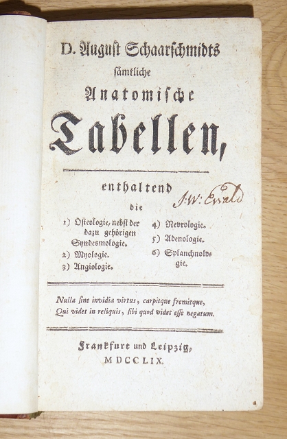 Schaarschmidt, August: D. August Schaarschmidts sämtliche Anatomische Tabellen, enthaltend die 1) Osteologie, nebst der dazu gehörigen Syndesmologie. 2) Myologie. 3) Angiologie. 4) Neurologie. 5) Adenologie, 6) Splanchnologie. Frankfurt und Leipzig, Verlag nicht ermittelbar, MDCCLIX. 8°. 2 ungezählte Blätter, 12 ungezählte Seiten, 175 Seiten, 1 ungezähltes Blatt, 6 ungezählte Seiten, 80 Seiten, 1 ungezähltes Blatt, 2 ungezählte Seiten, 120 Seiten, 1 ungezähltes Blatt, 2 ungezählte Seiten, 96 Seiten, 1 ungezähltes Blatt, 6 ungezählte Seiten, 96, 32 Seiten, 1 ungezähltes Blatt, 6 ungezählte Seiten, 208 Seiten. Ledereinband, Lederrückenschild, Rückenvergoldung. Farbschnitt. Einband berieben u. bestossen, Kapitale mit kleinen Fehlstellen,Gelenk aussen oberflächlich etwas mürbe. Titelblatt mit Besitzervermerk alter Hand u. kl. Notiz auf Folgeblatt, sonst gute, saubere Erhaltung. festes Exemplar.