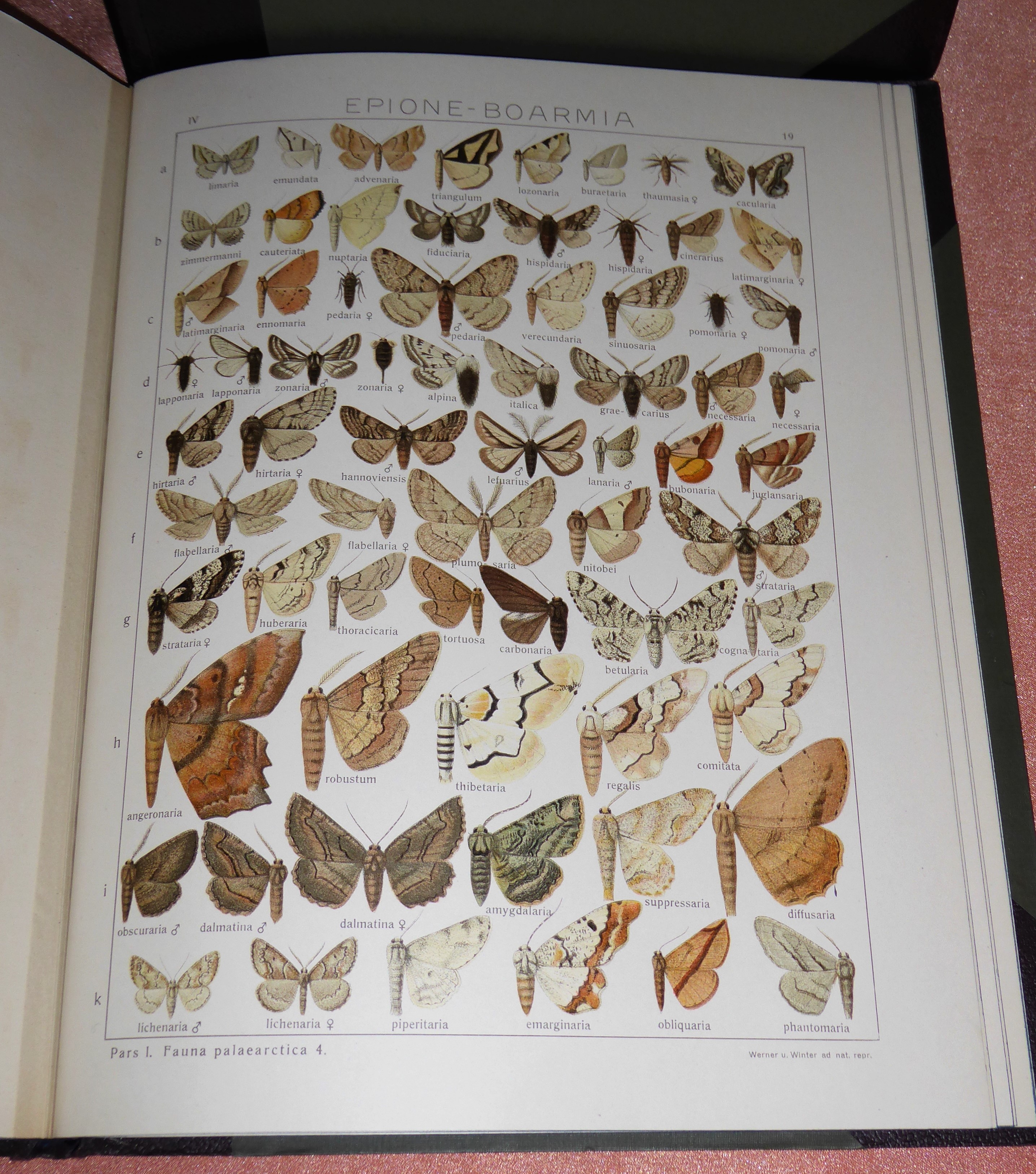 Seitz, Adalbert: Die Gross-Schmetterlinge der Erde. Eine systematische Bearbeitung der bis jetzt bekannten Gross-Schmetterlinge. 1. Abteilung: Die Gross-Schmetterlinge des Paläarktischen Faunengebietes. 4. Band: Die spannerartigen Nachtfalter mit 25 kolorierten Tafeln (1977 Figuren). 2 Bände (Text + Tafeln). Stuttgart, Verlag des Seitz’schen Werkes (Alfred Kernen), 1915, 32,5 cm. VIII, 766 Seiten Text und Tafelband mit 53 kolorierten Tafeln. Leinen mit Rückentitel, blauer Farbschnitt. sehr gutes Exemplar.