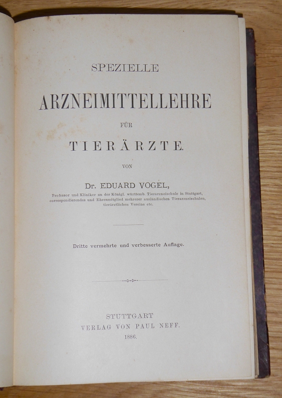 Vogel, Eduard: Specielle Arzneimittellehre für Thierärzte. 3. vermehrte und verbesserte Auflage, Stuttgart, Neff, 1886, 22 cm. XII, 604 S., Halbleder-Einband mit Rückentitel, Einband berieben und Kanten bestossen. Vorsätze fleckig sonst innen nur wenig fleckig. Register: wenige Blätter zur Hälfte gelöst, sonst festes vollständiges Exemplar.