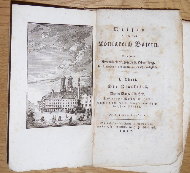 Obernberg, Joseph von: Reisen durch das Königreich Baiern. 1. Theil: Der Isarkreis. Vierter Band. III. Heft. Des ganzen Werkes Heft 12: Topographie der königl. Haupt- und Residenzstadt München. München, Leutner, 1817. 19 cm. VI, Seite 290 bis 460 S., 1 Kupferstich, Obernberg, Schrift in Fraktur. Interimseinband, Gebrauchsspuren. Einband gebräunt und fleckig. Buchrücken fehlt. Seiten mit Eckknicken. Papier innen leicht gebräunt. Die ersten 3 Blatt zur Hälfte gelöst, sonst festes, gut lesbares Exemplar.