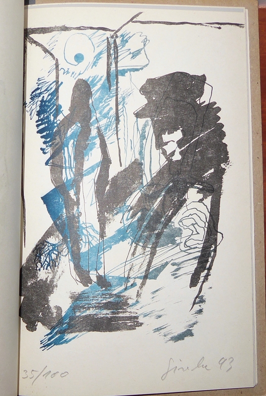 Hölderlin, Friedrich / Hans Ulrich Prautzsch [Hrsg.]: Almanach Hölderlin ’93. Erschienenen zum 150. Todestag Hölderlins. Die SIGNIERTEN Graphiken wurden per Hand von den Künstlern abgezogen. (von Otto Möhwald, Guillermo Deisler, Ralf Langer, H.-U. Prautzsch, Bettina Vetter u.a.). Nr. 83 von 100 nummerierten Exemplaren. Halle, Uräus-Handpresse, 1993. 32x22 cm. 35 Blatt, dabei 18 signierte Original-Graphiken. orig. Halbleinen, Einband mit schwachem Lichtrand, ein Blatt mit sehr kleinem Eckabriss, sonst sehr gutes Exemplar.