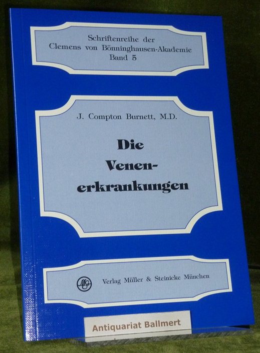 Burnett, James Compton: Die Venenerkrankungen. Speziell Venosität, Vakikozele, Hämorrhoiden, Variköse Venen und ihre Behandlung mit Arzneimitteln. München, Müller & Steinicke, 1992, 21 cm. 77 Seiten, Broschur, gutes Exemplar. (Schriftenreihe der Clemens-von-Bönninghausen-Akademie ; Bd. 5).