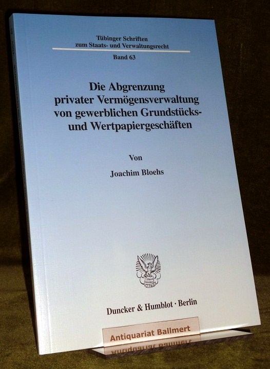 Bloehs, Joachim: Die Abgrenzung privater Vermögensverwaltung von gewerblichen Grundstücks- und Wertpapiergeschäften. Berlin, Duncker und Humblot, 2001. 24 cm. 223 Seiten, Broschur, Softcover, sehr gutes Exemplar, wie neu. [Tübinger Schriften zum Staats- und Verwaltungsrecht ; Bd. 63].