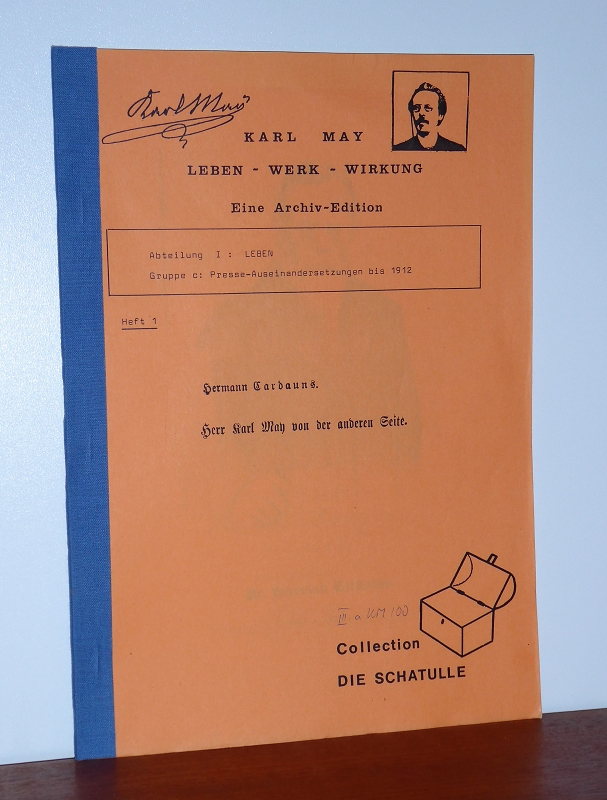 Cardauns, Hermann: Herr Karl May von der anderen Seite (= Karl May – Leben – Werk – Wirkung – Eine Archiv-Edition – Abteilung I : Leben – Gruppe c: Presse-Auseinandersetzung bis 1912 Heft 1). Abt. I: Leben, Gruppe C: Presse-Auseinandersetzungen bis 1912 Reprint der Ausgabe 1912. Bad Segeberg, Collection ‚Die Schatulle‘ ohne Jahr. 30x21 cm. 33 einseitig bedruckte, faksimilierte Seiten. Geheftet, gutes Exemplar.