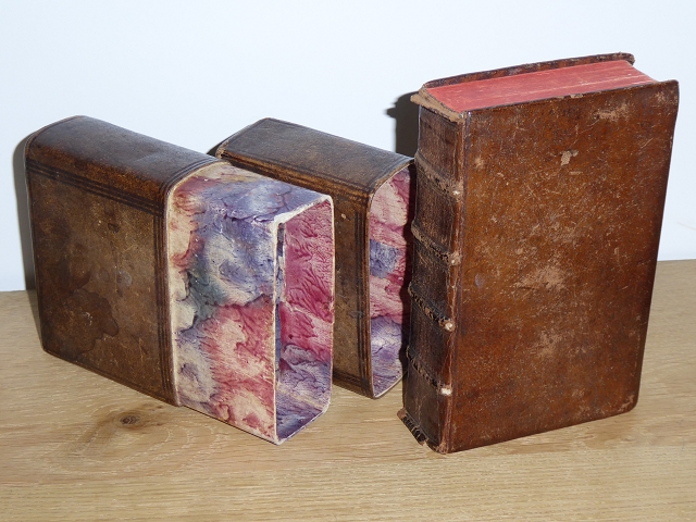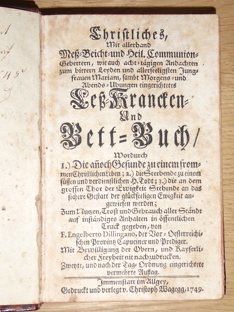 Engelbertus, : Christliches, Mit allerhand Meß–, Beicht- und Heil. Communion-Gebettern, wie auch acht-tägigen Andachten zum bittern Leyden, und allerseeligsten Jungfrauen Mariam, sambt Morgen- und Abends-Ubungen eingerichtetes Leß–, Krancken- Und Bett-Buch. Wordurch Die annoch Gesunde zu einem frommen Christlichen Leben, die Sterbende zu einem süssen, verdienstlichen Heil. Todt, die an dem grossen Thor der Ewigkeit Stehende an das sicherer Gestatt der glückseeligen Ewigkeit angewiesen werden … Immenstatt im Allgey, Wagegg, 1749. 17x11 cm. [12] Bl., 527 S., [4] Bl., Ledereinband der Zeit mit umlaufenden Rotschnitt in Lederschachtel. Gering berieben. Buchrücken oben u. unten gering eingerissen. Vorsatz von alter Hand beschrieben. durchgehend etwas braunfleckig. Trotz der genannten Mängel insgesamt gutes Exemplar.