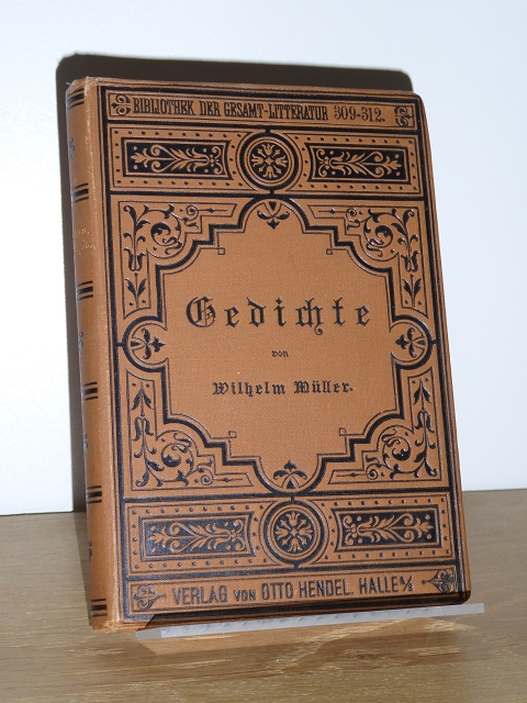 Müller, Wilhelm: Gedichte von Wilhelm Müller. Gesamtausgabe. [Aus der Reihe Bibliothek der Gesamt-Literatur 309-312]. Halle Hendel, o.J. 18x13 cm. 327 Seiten. Leinen mit Schwarzprägung, umlaufender Rotschnitt. Buchdeckel innen mit Exlibris, Papier etwas gebränt, insgesamt gute bis sehr gute Erhaltung.