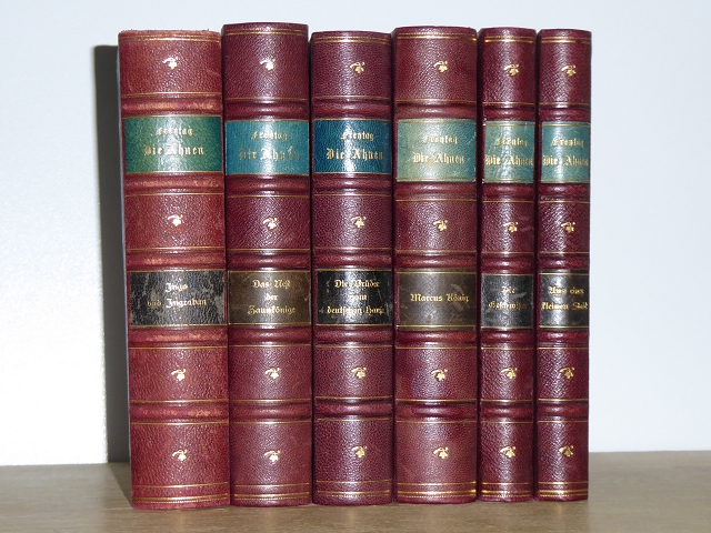 Gustav Freytag: Die Ahnen. Roman [vollständig in 6 Bänden]. Band 1: Ingo und Ingraban. Band 2: Das Nest der Zaunkönige. Band 3: Die Brüder vom deutschen Hause. Band 4: Marcus König. Band 5: Die Geschwister. Band 6: Aus einer kleinen Stadt. Mischauflage. Leipzig, Hirzel, 1915-1918. 18x12 cm. Insgesamt 2636 Seiten. In Frakturschrift. Halbleder-Ausgabe, Lederrückenschild mit Rückengoldprägung. Dreiseitig marmorierter Schnitt. Stellenweise gering berieben, Papier etwas gebräunt, ein Band mit Monogrammstempel, insgesamt gute bis sehr gute Erhaltung.