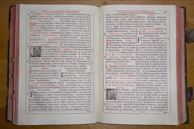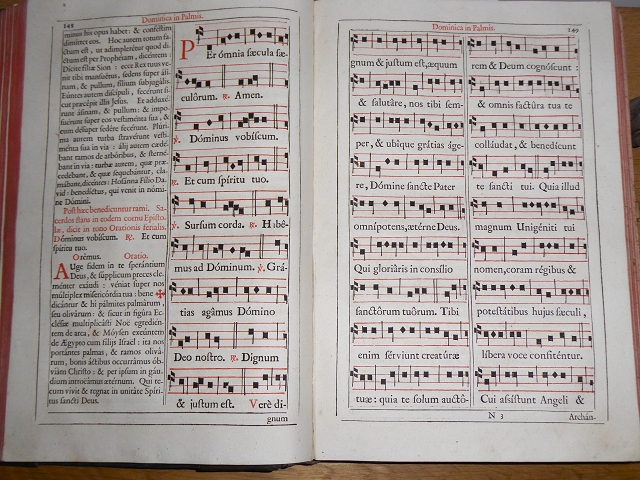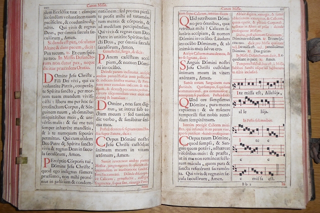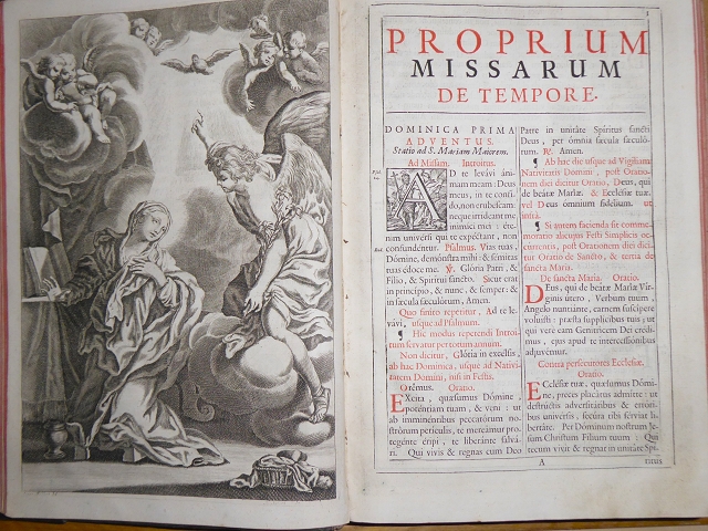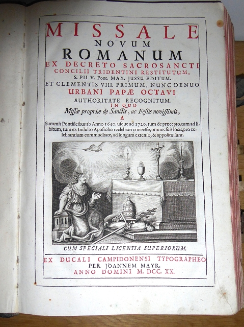 Missale Novum Romanum. Ex Decreto Sacrosancti Concilii Tridentini Restitutum, Pii V. Pont. Max. Jussu Editum; Et Clementis VIII. Primum, Nunc Denuo Urbani Papae Octavi Auctoritate Recognitum; In Quo Missae propriae de Sanctis, ac Festis novissimis; A Summis Pontificibus ab Anno 1640. usque ad 1720. tum de praecepto, tum ad libitum, tum ex Indulto Apostolico celebrari concessae, omnes suis locis, pro celebrantium commoditate, ad longum extensae, & appositae sunt. Kempten, Mayr, 1720. 35,5x24 cm. [33] Bl., 636, CXXVIII S., [2] Bl., 9 [1] Seiten. 11 Kupferstich-Illustrationen, Zweispaltiger Druck in Rot und Schwarz mit einigem Holzschnitt-Buchschmuck und zahlreichen Melodien und Noten in Typendruck. Einigen figuralen Holzschnitt-Initialen.