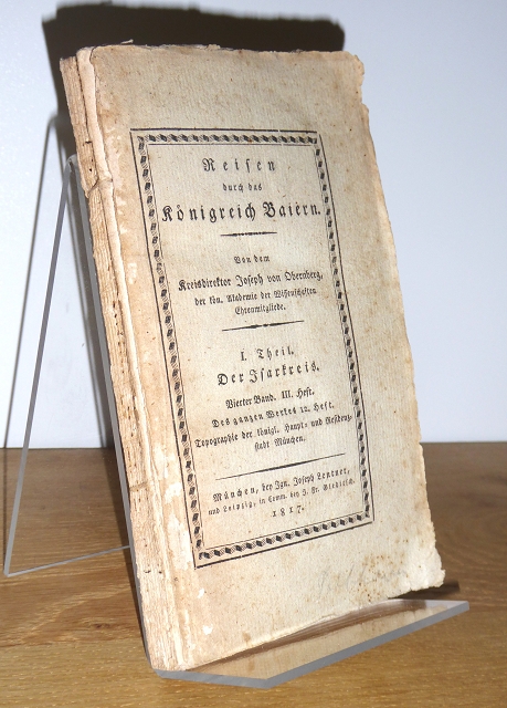Obernberg, Joseph von: Reisen durch das Königreich Baiern. 1. Theil: Der Isarkreis. Vierter Band. III. Heft. Des ganzen Werkes Heft 12: Topographie der königl. Haupt- und Residenzstadt München. München, Leutner, 1817. 19 cm. VI, Seite 290 bis 460 S., 1 Kupferstich, Obernberg, Schrift in Fraktur. Interimseinband, Gebrauchsspuren. Einband gebräunt und fleckig. Buchrücken fehlt. Seiten mit Eckknicken. Papier innen leicht gebräunt. Die ersten 3 Blatt zur Hälfte gelöst, sonst festes, gut lesbares Exemplar.