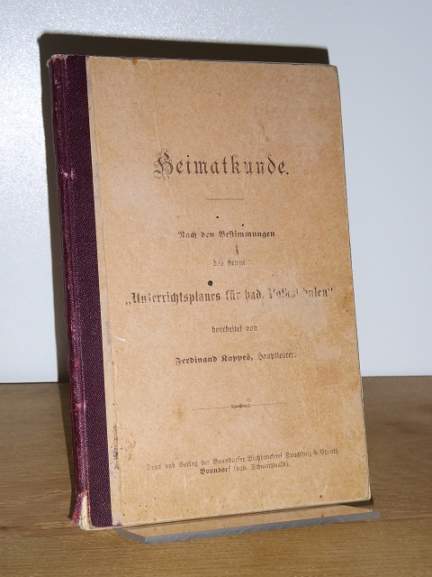 Kappes, Ferdinand: Heimatkunde. Nach den Bestimmungen des neuen „Unterrichtsplanes für bad. Volksschulen“. Bonndorf (bad. Schwarzwald), Spachholz & Ehrath, 1906. 20,5 cm, XIII, 105 S. graph. Darst., Schrift in Fraktur, fester Pappband mit Leinenrücken, Gebrauchsspuren, Einband berieben und Rücken leicht eingerissen. Namensvermerk mit Datum. Weinige kurze Anstreichungen. Vereinzelte Lagen wenig angelöst aber noch fest.