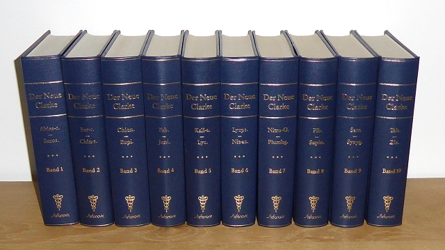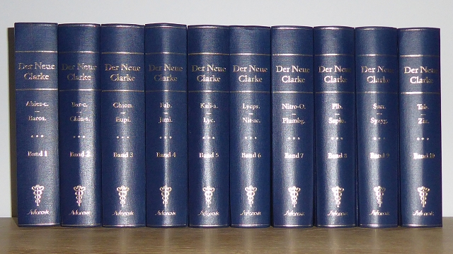 Buchpaket – Clarke, John Henry / Vint, Peter /Grudzinski, Thomas von/ Scheible, Karl-Friedrich: Der neue Clarke. 10 Bände (=vollständig), Eine Enzyklopädie für den homöopathischen Praktiker ; nebst genauer Angabe der Abstammung der Symptome. Völlig neu bearb., vielfach berichtigte ins Dt. übertr. und vermehrte Ausg. des Dictionary of practical materia medica von John Henry Clarke; Bielefeld/Enger, Stefanovic/Grohmann, Homöopathische Literatur, 1990-1996, 21,5 cm. XXV, 6418 Seiten, Orig. blauer Leineneinband, Band 5 unterer Schnitt einige Seiten mit leichtem Wasserschaden – Buch vollständig und nicht verklebt; Band 7 vorderer Einbanddeckel etwas gewölbt. Einige Abschnitte mit Anstreichungen und Ergänzungen mit Farbstift, insgesamt gute Erhaltung.