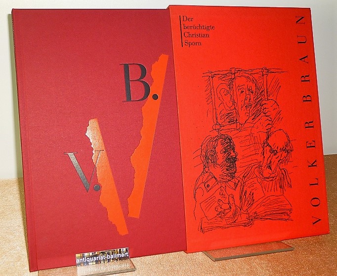 Braun, Volker: Der berüchtigte Christian Sporn. Ein anderer Woyzeck. Mit fünf blattweise SIGNIERTEN Radierungen und sechs Zeichnungen (davon zwei auf dem Schuber) von Joachim John. 150 arabisch numerierte Exemplare, hier die Nummer 149/150. Im Impressum von Volker Braun und Gert Wunderlich signiert. Leipzig, Leipziger Bibliophilen-Abend, 2004. 28,5 X 19 cm. 61 S., Ill., fester Pappband in illustriertem Schmuckschuber, sehr gutes Exemplar. Leipziger Druck Bd. 14. Herausgegeben von Herbert Kästner.